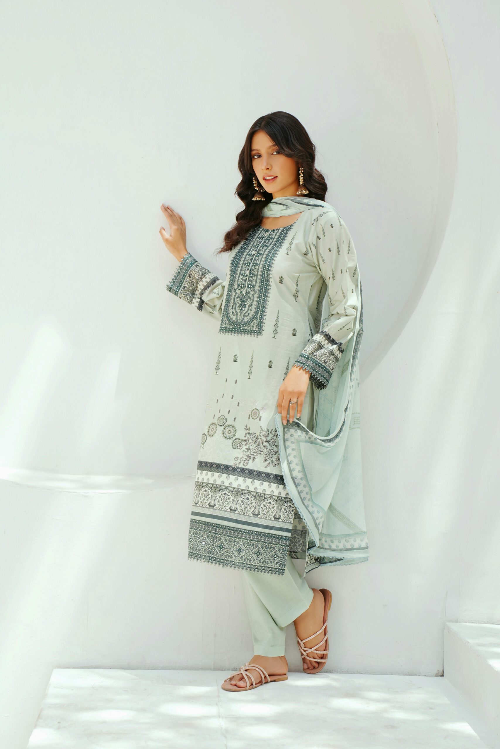 • Dupatta: A complementary, sheer mint green dupatta with a printed border and scattered motifs.